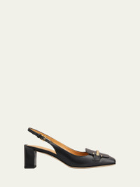 Tod's "Cuoio" calf leather slingback pumps feature metal bar and stamped tod's logo secured by side straps 2.00 in / 50 mm covered block heel Square moc toe Adjustable slingback strap Leather outsole Lining: Leather Spot clean Made in Italy Online Inquiries: BGS21_X6R64| Store Inquiries: #4902816