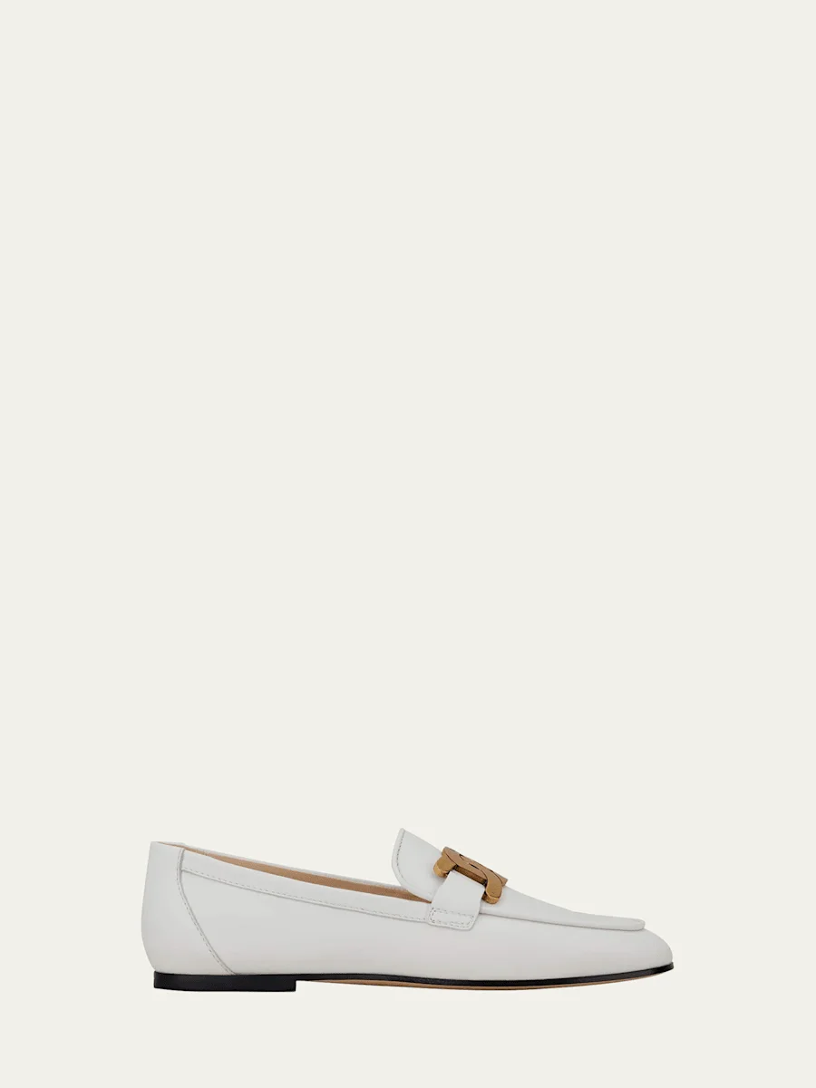 Tod's "Kate 79a" smooth calf leather loafers. Flat heel. Round apron toe. Notched vamp with chain strap. Slip-on style. Leather lining. Smooth sole. Made in Italy. Online Inquiries: BGS21_X5E5R| Store Inquiries: #4100514