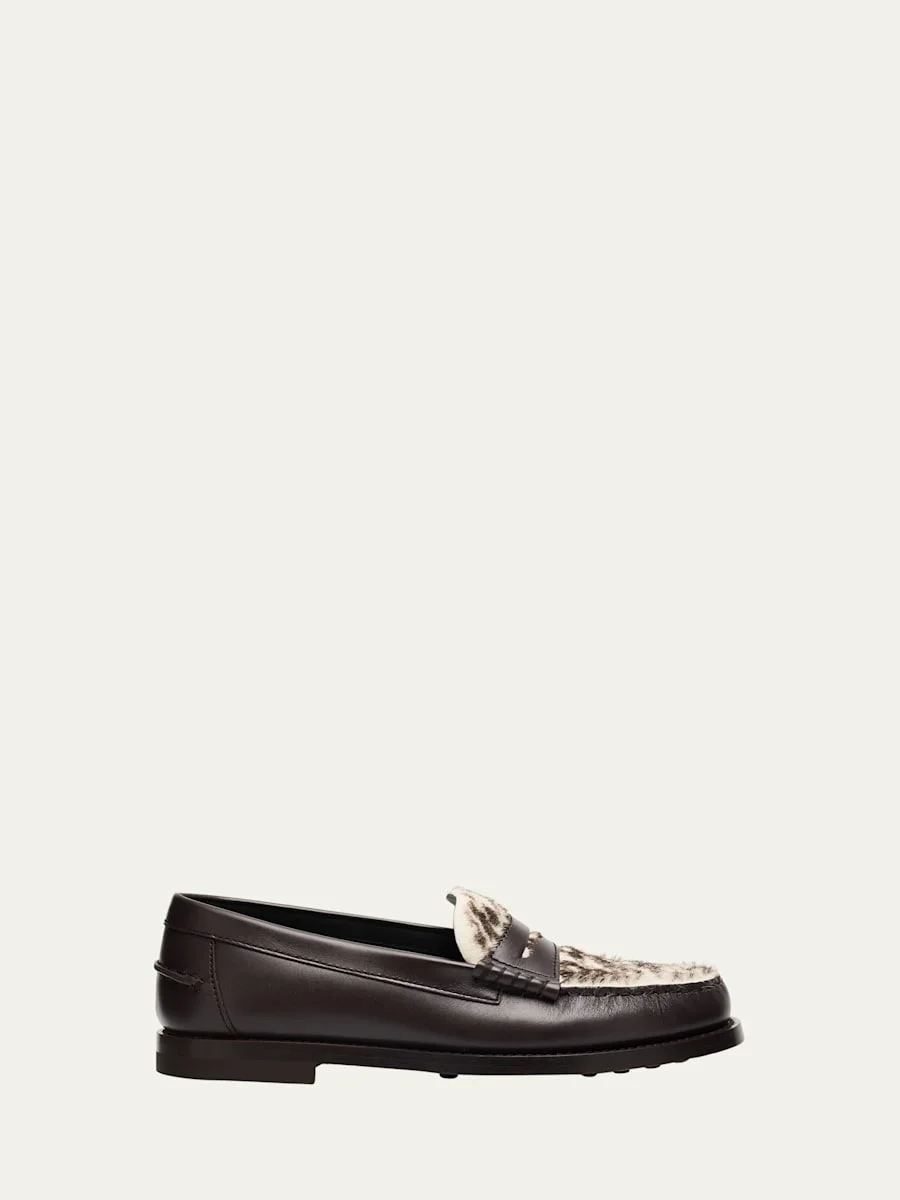 Tod's loafers in smooth calf leather and dyed pony hair (Italy) Stacked heel Round moc toe Leather penny keeper strap Leather lining Logo-embossed footbed Leather outsole with embossed rubber pebbles Slip-on style Spot clean Made in Italy Online Inquiries: BGS21_X6Y4K| Store Inquiries: #5048737