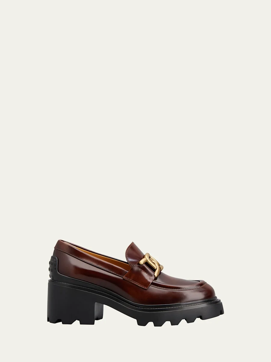 Tod's sleek leather casual loafers with chain accent 2.36 in / 60 mm block heel Round moc toe Notched vamp Slipon style Rubber outsole Lining: Leather Made in Italy