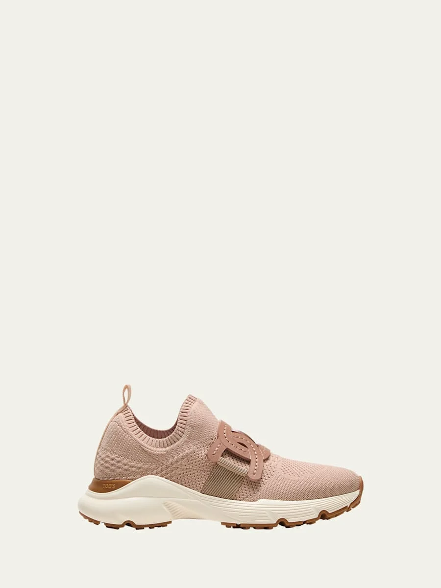 Tod's stretch polyester knit sneakers with leather chain accent. Flat heel. Round reinforced toe. Elastic strap vamp. Slipon style. Elastic sock collar. Cushioned footbed. Lining: Polyester/polyurethane. Rubber sole. Made in Italy.