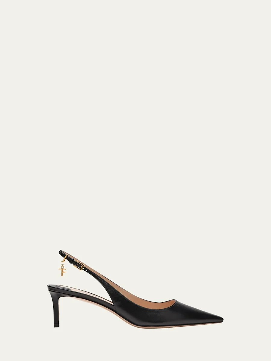 TOM FORD "Angelina" leather pumps with TF logo charm accent 2.25 in / 55 mm stiletto heel Pointed toe Adjustable slingback strap Leather outsole Lining: Goat leather Made in Italy