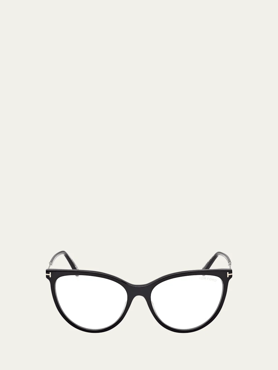 TOM FORD "FT5994BW" cateye eyeglasses Eye/bridge/temple (in mm): 5616140 Readytowear clear lenses enhanced by a blue coating, able to reduce the risks related to blue light exposure from LED screens Saddle nose bridge Signature T temples Thin, tapered arms Acetate Made in Italy