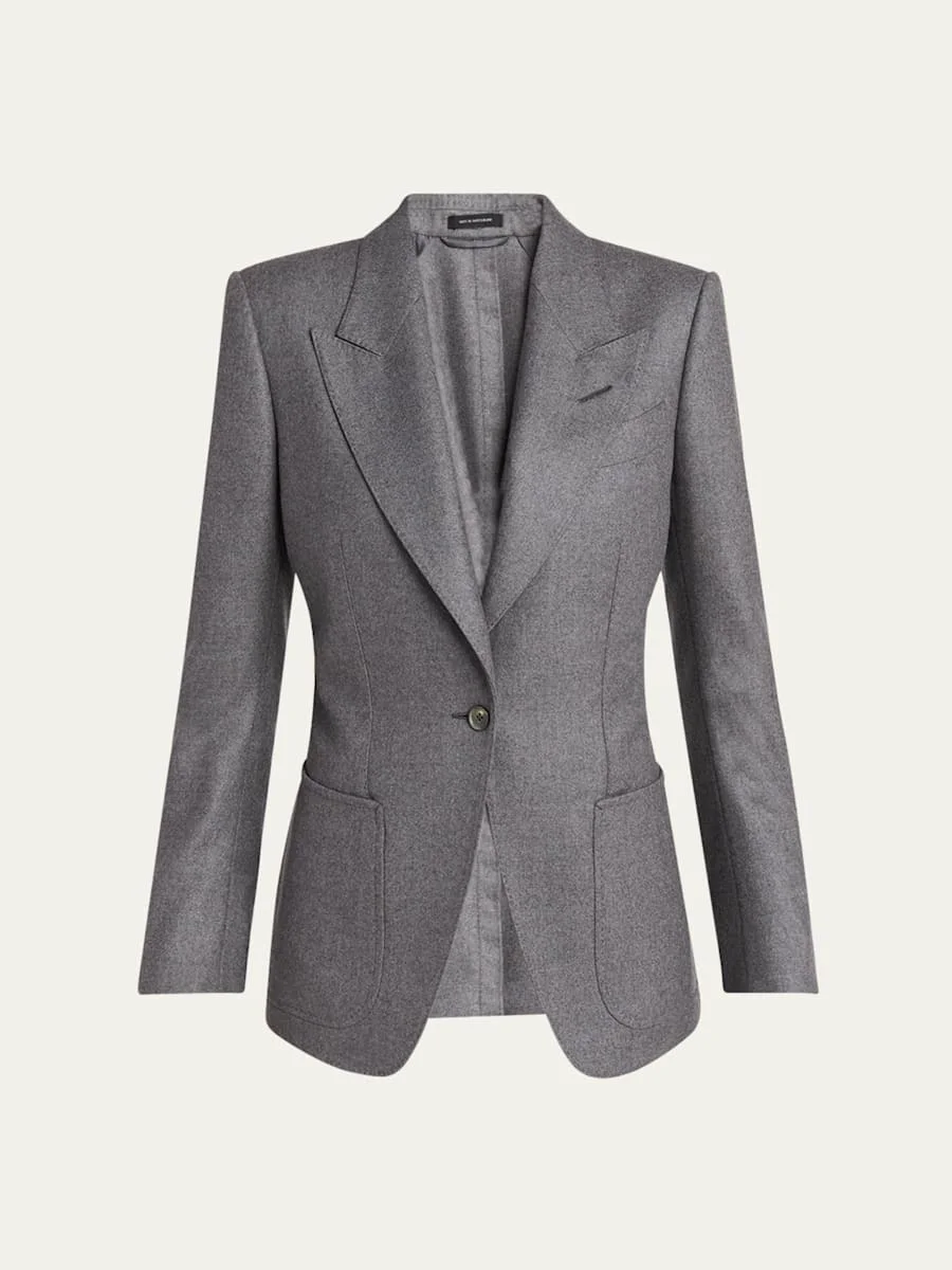 TOM FORD blazer jacket in brushed cashmere Peak lapels; single-breasted front Long sleeves; button cuffs Padded shoulders Chest welt pocket Hip patch pockets Slim fit Wool/cupro/silk Made in Italy Online Inquiries: BGS21_BA4L8| Store Inquiries: #5034281