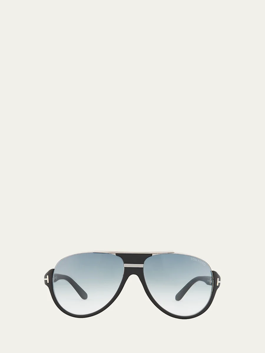 TOM FORD "Dimitry" half-rim aviator sunglasses. Eye/bridge/temple (in mm): 59-14-130. Ruthenium-plated metal and matte acetate frames. Blue gradient lenses. Signature T detail at temples. 100%25 UV protection. Universal fit. Made in Italy. Online Inquiries: BGS21_N4RX8| Store Inquiries: #53299