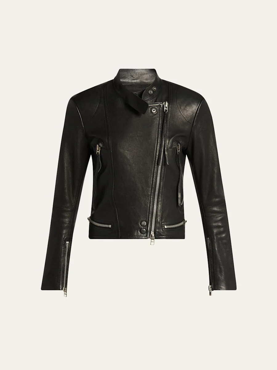 TOM FORD moto jacket in a supple calfskin leather adorned with silvertone zippers Band collar with snap latch; off-center two-way zip front Long sleeves; zip cuffs Padded shoulders Chest and hip zip pockets Straight fit Hip length Buckle hem Leather Lining: Silk Made in Italy Online Inquiries: BGS21_BAU5J| Store Inquiries: #5277996