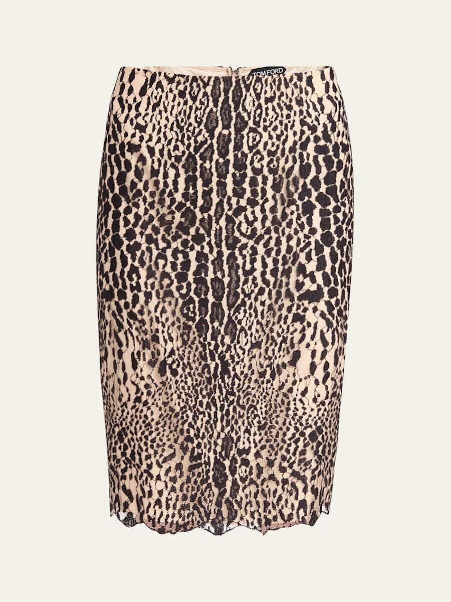 TOM FORD pencil skirt finishe din a leopard lace with a scalloped hem Mid waist Knee length Skirt falls straight from hip to hem Center-bsck vented hem Invisible back zip Viscose/nylon/polyamide/silk Made in Italy Online Inquiries: BGS21_BA4LJ| Store Inquiries: #5034291