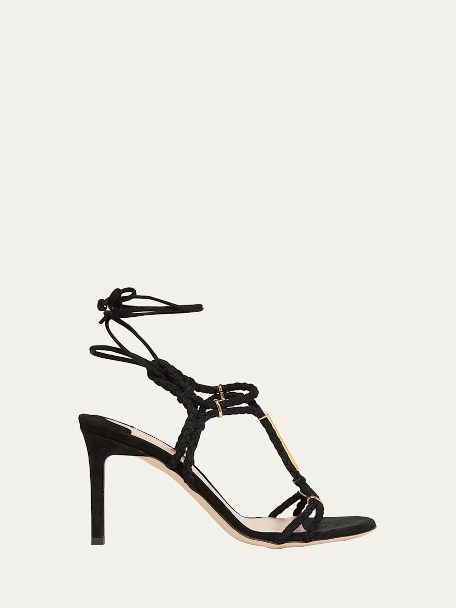 TOM FORD "Lily" strappy suede sandals with goldtone hardware 3.25 in / 85 mm stiletto heel Open toe Braided Tstrap caged vamp Wraparound ankle ties Lining: Leather Made in Italy