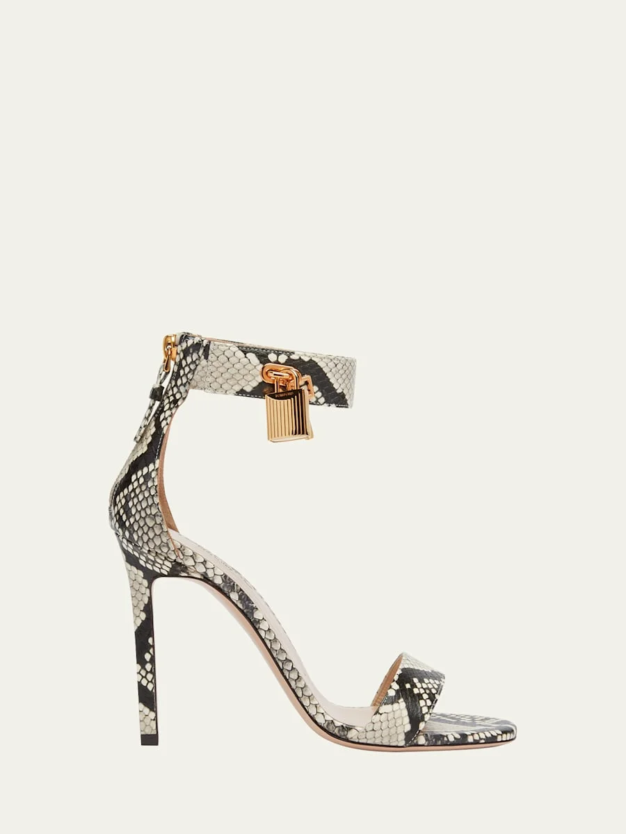 TOM FORD python-embossed leather sandals. Signature hanging padlock and key charm. 4.3" stiletto heel. Open toe. Ankle cuff with zip closure. Leather outsole. Made in Italy. Online Inquiries: BGS21_X6TWM| Store Inquiries: #4966888