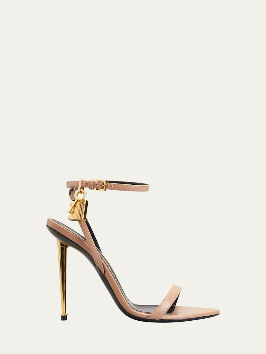 TOM FORD sandal in shiny goatskin leather. Signature hanging padlock and key charm. 4.3" metallic stiletto heel. Pointed open toe. Single band upper. Adjustable halter ankle wrap. Leather outsole. Made in Italy. Fit Note: True to size. Online Inquiries: BGS21_X5BE2| Store Inquiries: #4046038