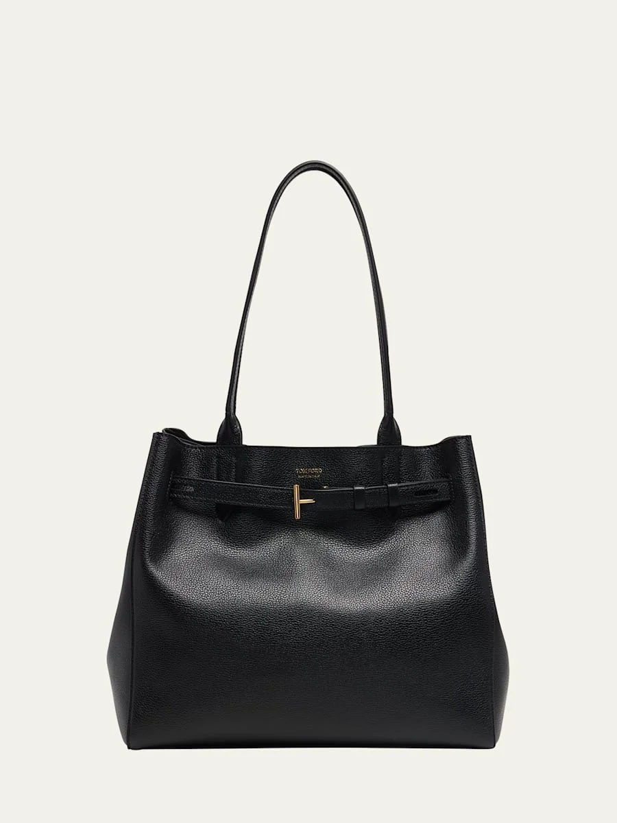 TOM FORD tote bag in grain leather, polyester, and brass Shoulder strap Open top with adjustable T-center strap Interior, one zip pocket Lining: Polyester Approx. 11"H x 13"W x 7.1"D Item Weight (Lbs.): 1.5 Made in Italy Online Inquiries: BGS21_V68K9| Store Inquiries: #4804086