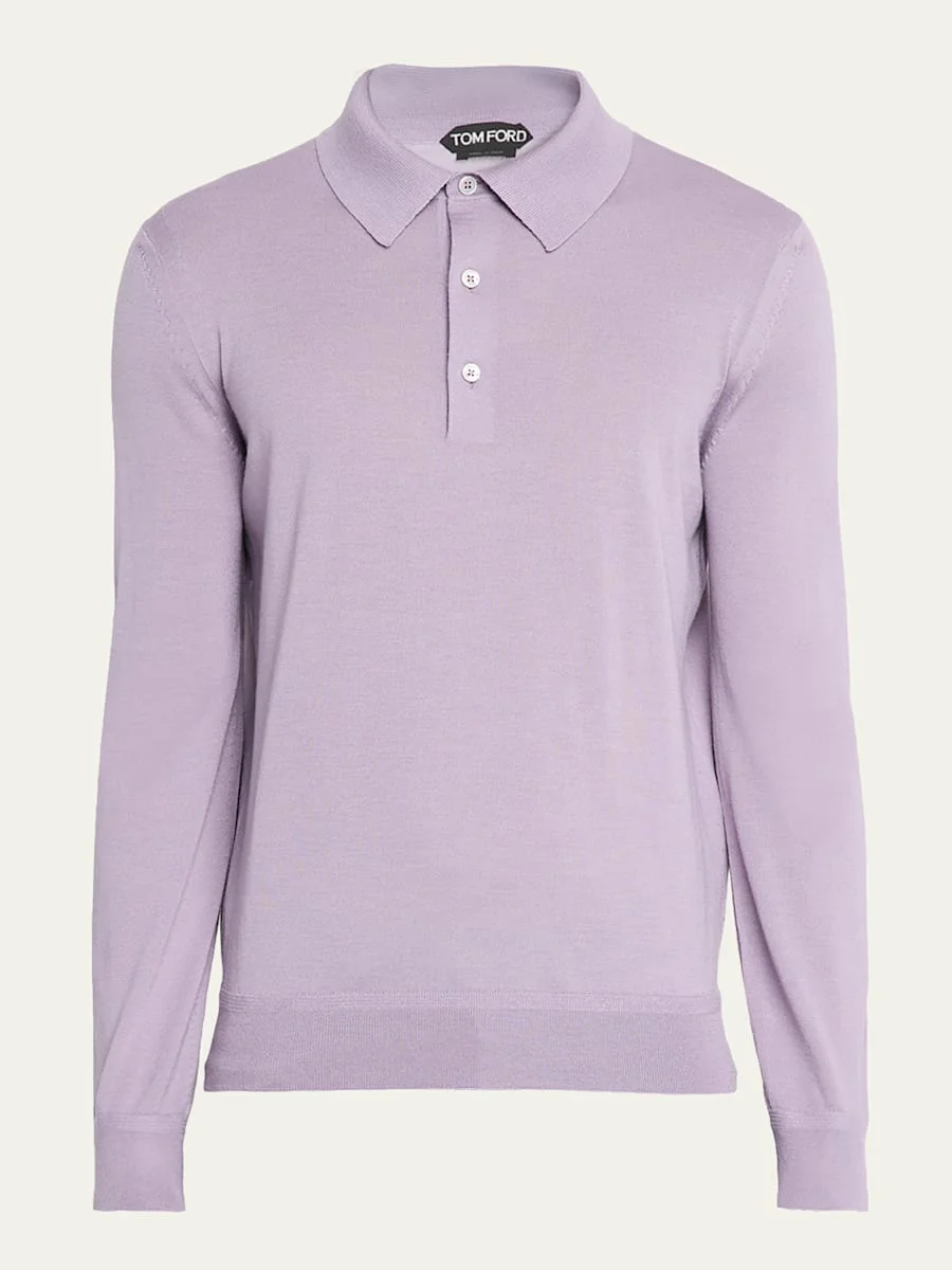 TOM FORD polo sweater in a sumptuous fine gauge knit cashmere and silk blend Shirt collar Threebutton placket Long sleeves Ribbed cuffs and hem Pullover style Cashmere/silk Unlined Professional cleaning recommended, wash inside out Made in Italy