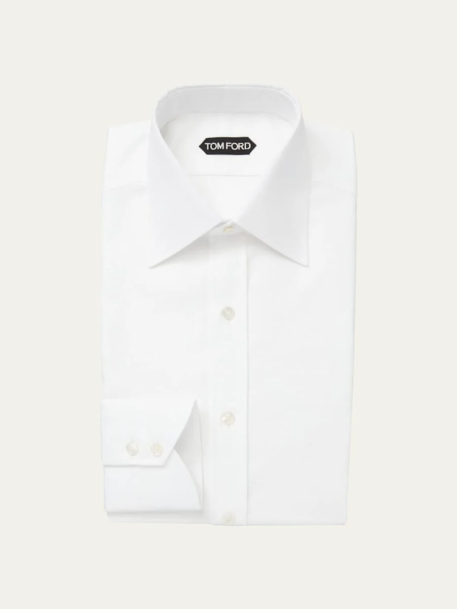 TOM FORD dress shirt in solid poplin. Classic collar; button front. Double-button cuffs. Classic fit. Shirttail hem. Cotton. Made in Italy. Model is 6'1"/185cm. Online Inquiries: BGS21_N6HS6| Store Inquiries: #3212170