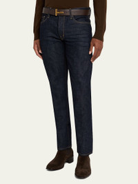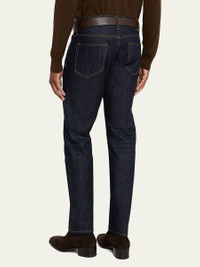 TOM FORD jeans in darkrinse selvedge denim with subtle Tinitial branding found on the contrast stitching Regular rise Fivepocket style Classic fit through straight legs Buttonzip front; belt loops Cotton/polyurethane Professional cleaning recommended Made in USA