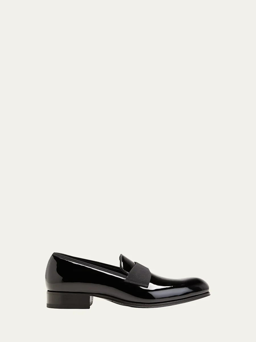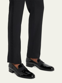 TOM FORD "Edgar" formal loafers in glossy patent leather Stacked heel; engraved TF-logo accent Round toe Grosgrain strap at vamp Leather lining Grosgrain trim Slip-on style Made in Italy Proposition 65 warning for California residents Online Inquiries: BGS21_N7CXM| Store Inquiries: #2869595