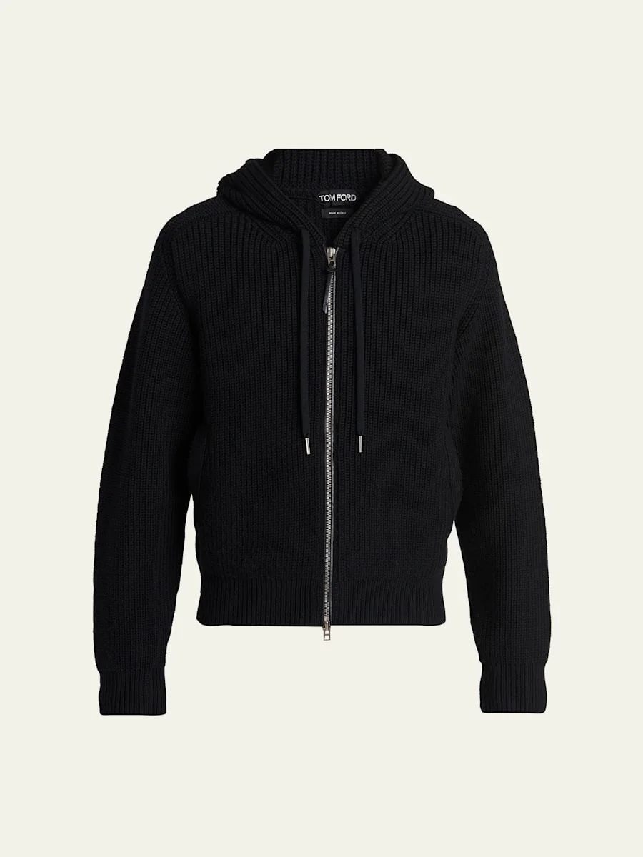 Knitted in soft merino wool, this TOM FORD hoodie elevates a classic silhouette with a luxurious look and feel. Hooded neckline with adjustable drawstrings Long sleeves with ribbed cuffs Relaxed fit Ribbed hem Twoway zipfront Wool Dry clean Made in Italy