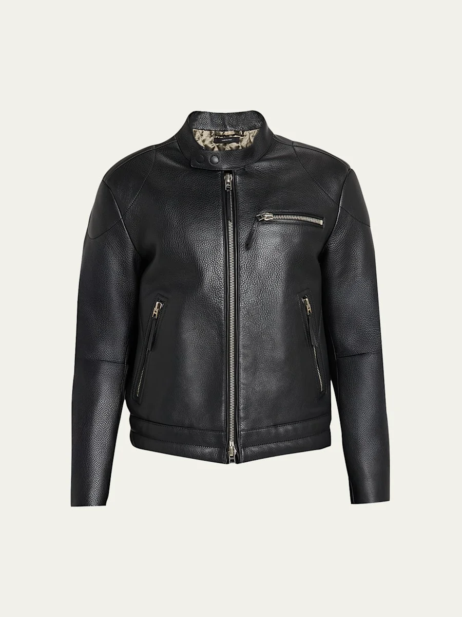 TOM FORD motoinspired biker jacket constructed from panels of supple fullgrain leather Band collar with button closure Long sleeves; zip cuffs Three zipped front pockets Hip length Slim fit Leather Leather method dry cleaning Made in Italy