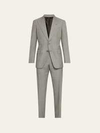 TOM FORD Shelton two-piece suit in solid sharkskin weave Slim fit Wool/cashmere/silk Lining: Cupro/silk Made in Italy Jacket: Peak lapels Buttonhole on left lapel Two-button front Chest welt pocket; breast pocket Hip flap pockets; ticket pocket Unfinished sleeves Double-vented back Trousers: Regular rise Extended hook-zip front Side on-seam pockets Side adjuster tabs Full length Model is 6'1"/185cm. Online Inquiries: BGS21_NC98M| Store Inquiries: #4835528