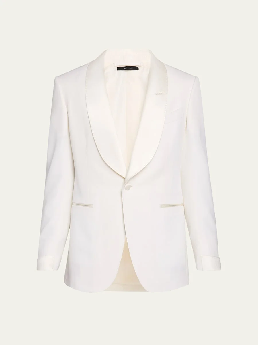 TOM FORD "Shelton" solid dinner jacket with satin trim Shawl lapels Singlebutton closure Chest welt pocket Hip besom pockets Turnback cuffs Doublevented back Wool/mohair Lining: Cupro/silk Made in Italy