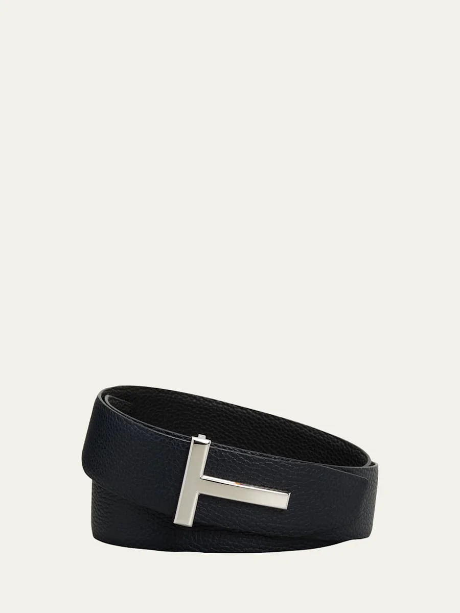 TOM FORD reversible belt in pebble-grain calf leather. Silvertone signature T buckle. Adjustable fit. Approx. width 1.6" Made in Italy. Online Inquiries: BGS21_N6F3X| Store Inquiries: #3180888