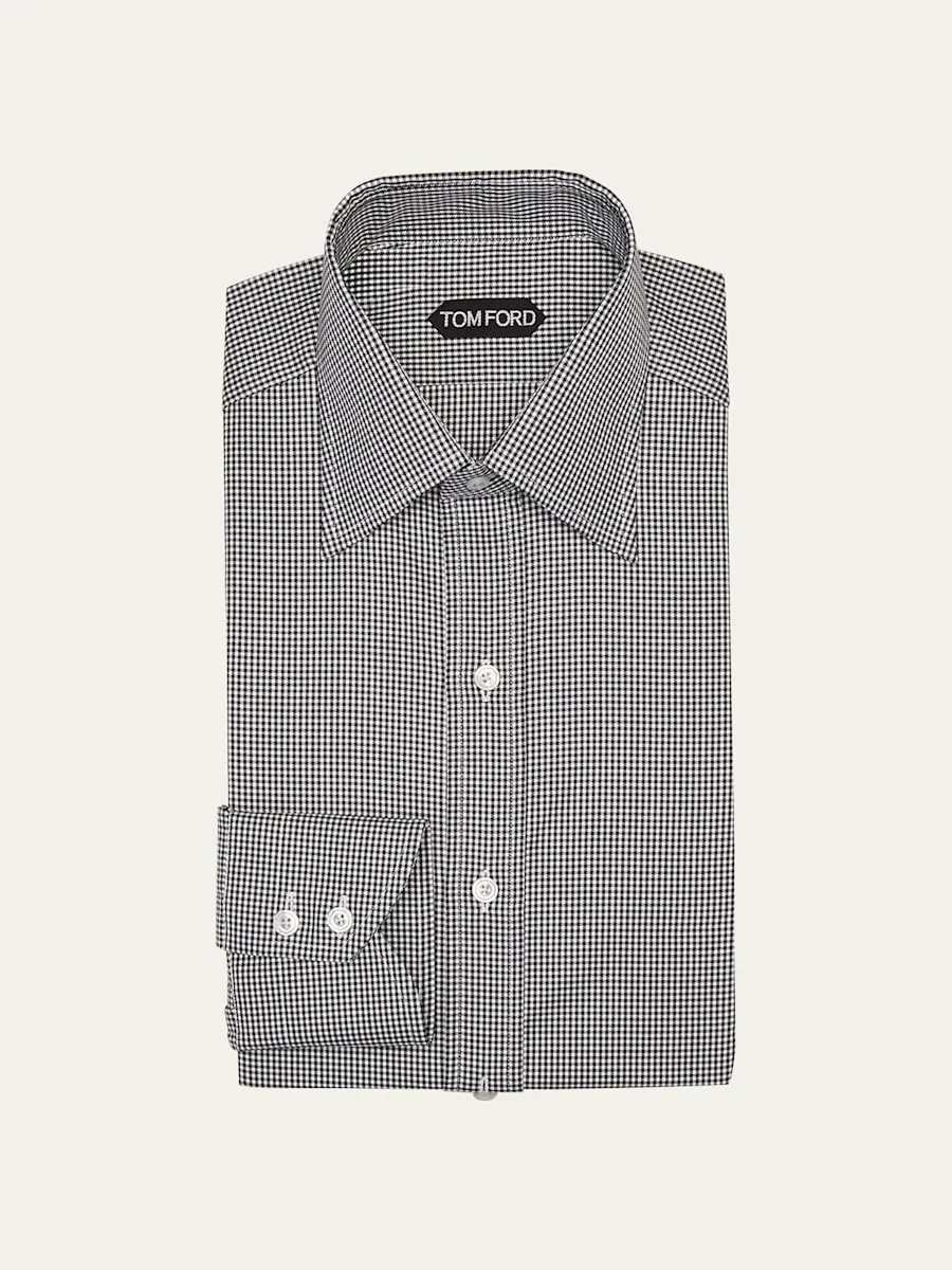 TOM FORD dress shirt features micro-check print Point collar; button placket Long sleeves Double-button mitered barrel cuffs Yoked back shoulders Shirttail hem Slim fit Lyocell/cupro Made in Italy Model is 6'1"/185cm. Online Inquiries: BGS21_N9LET| Store Inquiries: #4343357