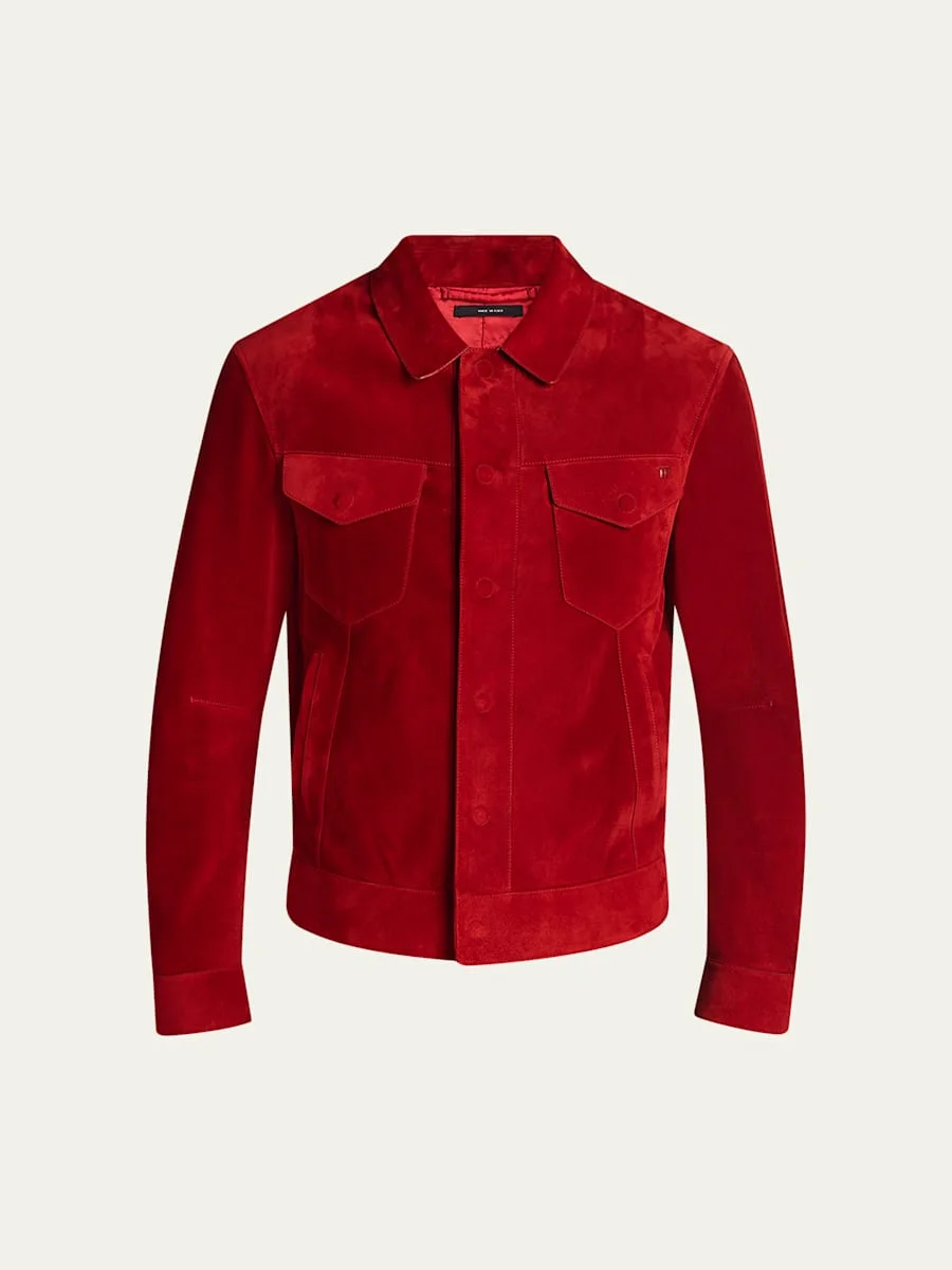 This TOM FORD western jacket is crafted from premium calf suede, offering a velvety finish with a supple handfeel. Point collar Concealed snap front Chest flap pockets Side welt pockets Snap cuffs Hem adjusters Classic fit Suede Lining: Cupro/viscose Professional cleaning recommended Made in Italy