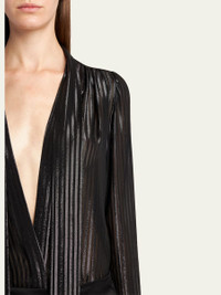 TOM FORD blouse in metallic striped lavalliere with a neck tie Plunging neckline Long sleeves; button cuffs Loose fit Hidden closure Silk/Lurex® metallic fiber Lining: Silk Made in Italy Online Inquiries: BGS21_B9UUV| Store Inquiries: #4975441