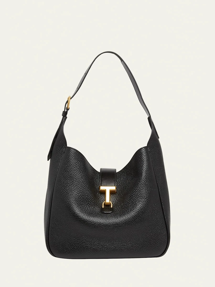 TOM FORD "Monarch" hobo bag in grain and smooth leather Adjustable shoulder strap Center T strap closure Interior, one zip pocket Approx. 11.4"H x 11.8"W x 4.7"D Made in Italy Online Inquiries: BGS21_V65W8| Store Inquiries: #4738301