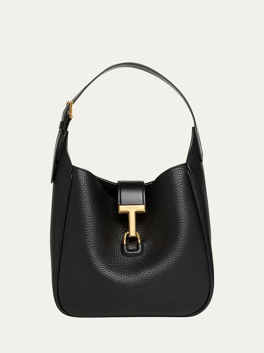 TOM FORD "Monarch" small sleek hobo bag crafted in grain leather with gold-tone hardware Adjustable shoulder strap Open top with center T clasp closure Interior, two slip pockets Lining: Leather Approx. 9.3"H x 8.9"W x 3.1"W Item Weight (Lbs.): 1.1 Made in Italy Online Inquiries: BGS21_V6K1U| Store Inquiries: #5027973