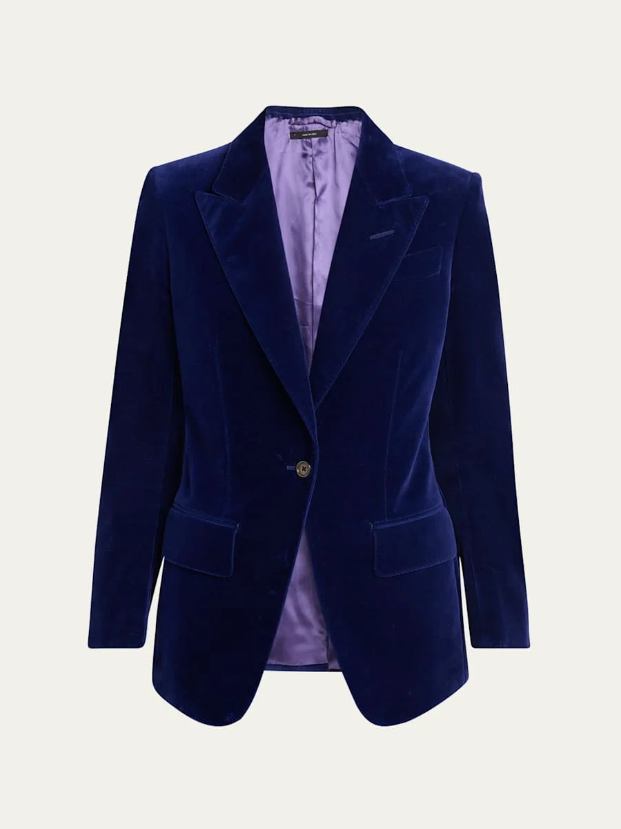 TOM FORD blazer jacket in velvet Peak lapels; single-breasted front Long sleeves; button cuffs Padded shoulders Chest welt pocket Hip flap pockets Slim tailored fit Walking vent back Cotton/cupro/silk Made in Italy Online Inquiries: BGS21_BA4LG| Store Inquiries: #5034289