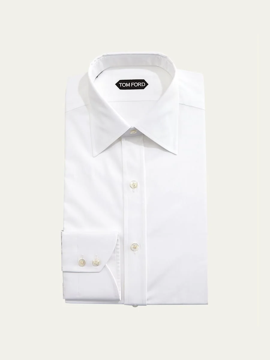 TOM FORD solid dress shirt. Spread collar; button front. Double barrel cuffs. Classic fit. Shirttail hem. Cotton; machine wash. Made in Switzerland. Online Inquiries: BGS21_M2WUM| Store Inquiries: #1672167
