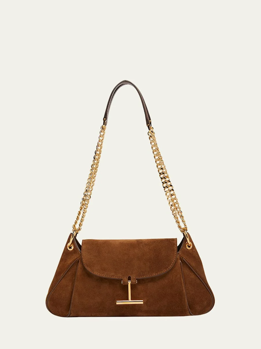 Crafted in calfskin suede, the TOM FORD "Tara" shoulder bag is finished with leather piping and gold-tone hardware Sliding chain and leather shoulder straps Can be worn as a shoulder or crossbody bag Flap top with T magnetic closure Interior, one zip pocket Lining: Polyurethane Trim: Leather Approx. 5.9"H x 11.4"W x 2.3"D Item Weight (Lbs.): 1.3 Made in Italy Online Inquiries: BGS21_V6K1W| Store Inquiries: #5027975