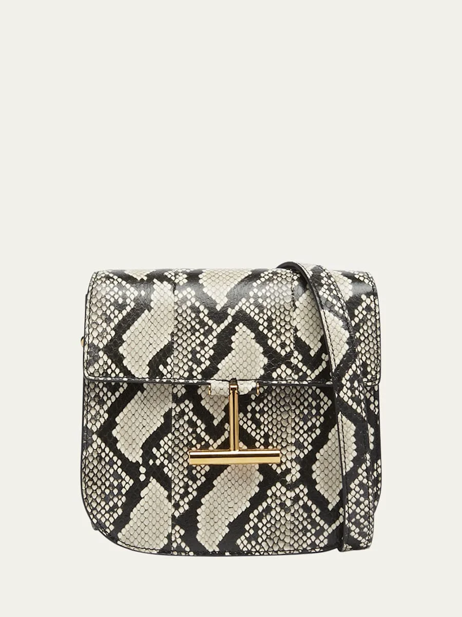TOM FORD "Tara" saddle crossbody bag in python-printed leather and polyurethane Adjustable crossbody strap Flap top with T bar magnetic closure Exterior, back slip pocket Interior, one zip pocket Approx. 7.3"H x 7.9"W x 2.8"D Made in Italy Online Inquiries: BGS21_V6G59| Store Inquiries: #4973475