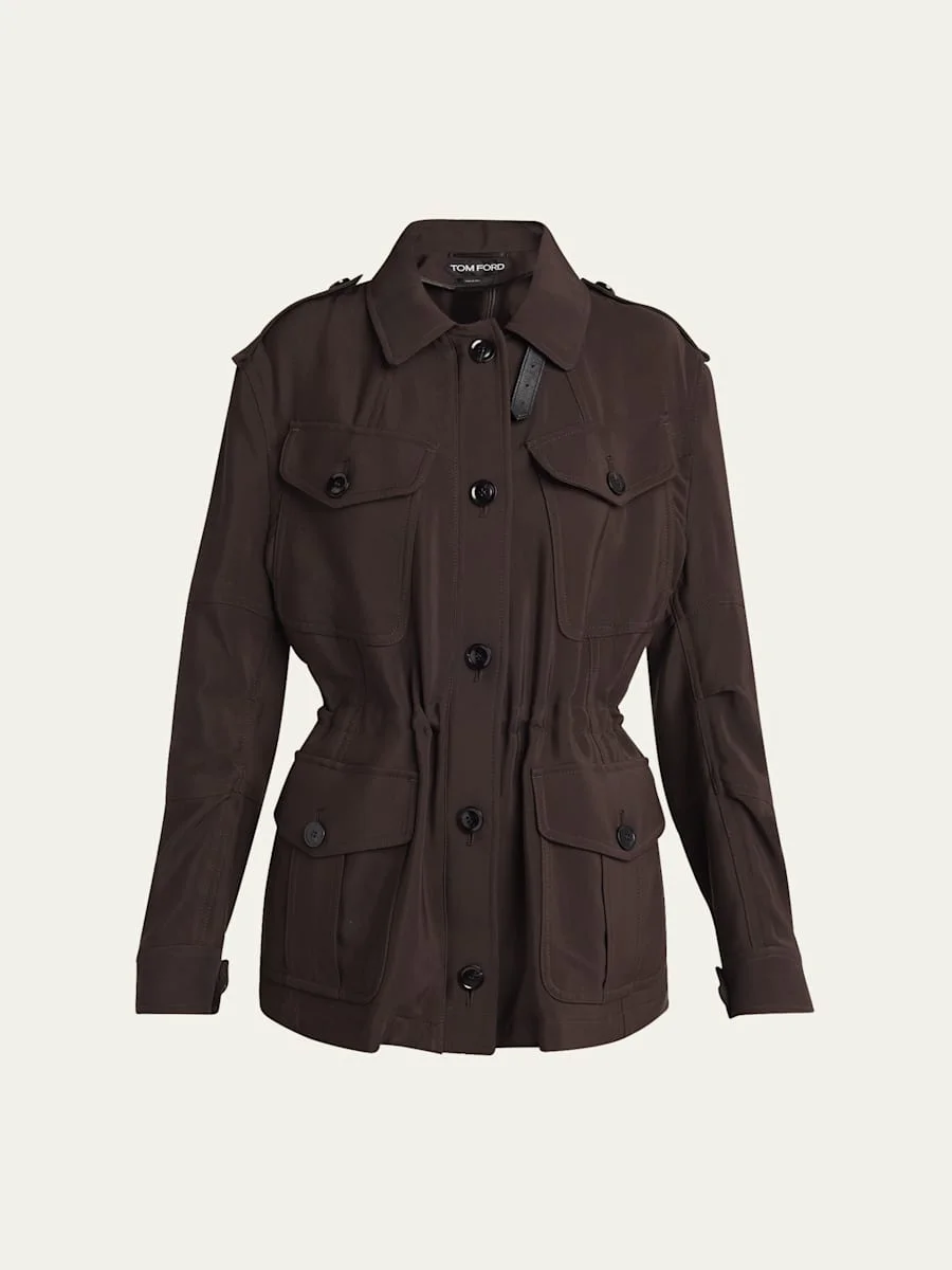 TOM FORD field jacket featuring a leather throat latch and internal drawstring cinched waist Point collar; single-breasted front Long sleeves; button cuffs Shoulder epaulets Front button-flap pockets Inner drawstring waist Regular fit Hem falls below the hip Button closure Viscose/leather/wool Made in Italy Online Inquiries: BGS21_BA4L4| Store Inquiries: #5034277