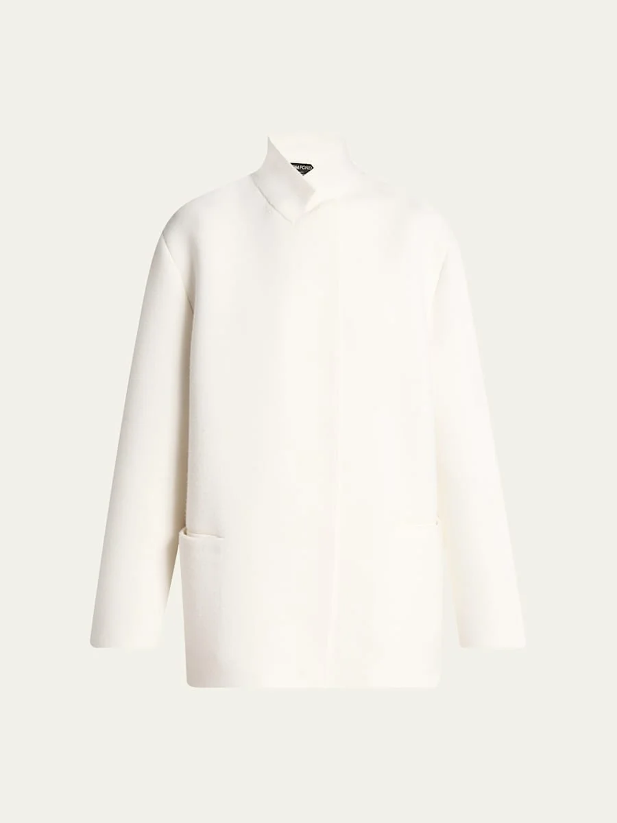 TOM FORD jacket crafted of cashmereblend knit with a signature goldtone Tpin Stand collar; open front Long sleeves; unfinished cuffs Hip split pockets Loose fit Walking vent back Wool/cashmere/elastane Made in Italy