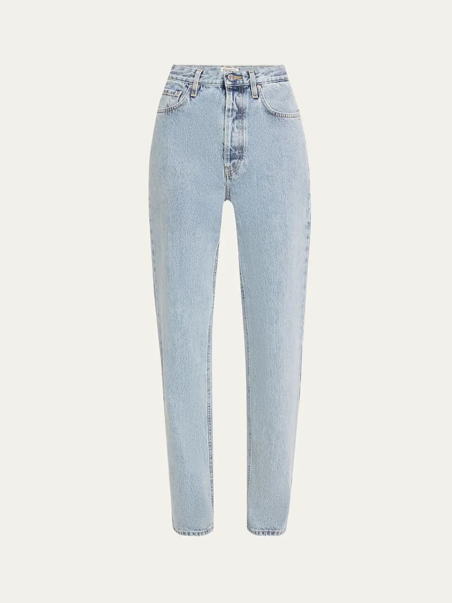 Toteme classic cut denim pants with a monogram-debossed leather patch Cropped at the ankle Mid rise Straight legs Five-pocket style Button/zip fly; belt loops Organic cotton Made in Italy Model is 5'10"/177cm. Online Inquiries: BGS21_B9CSC| Store Inquiries: #4840233