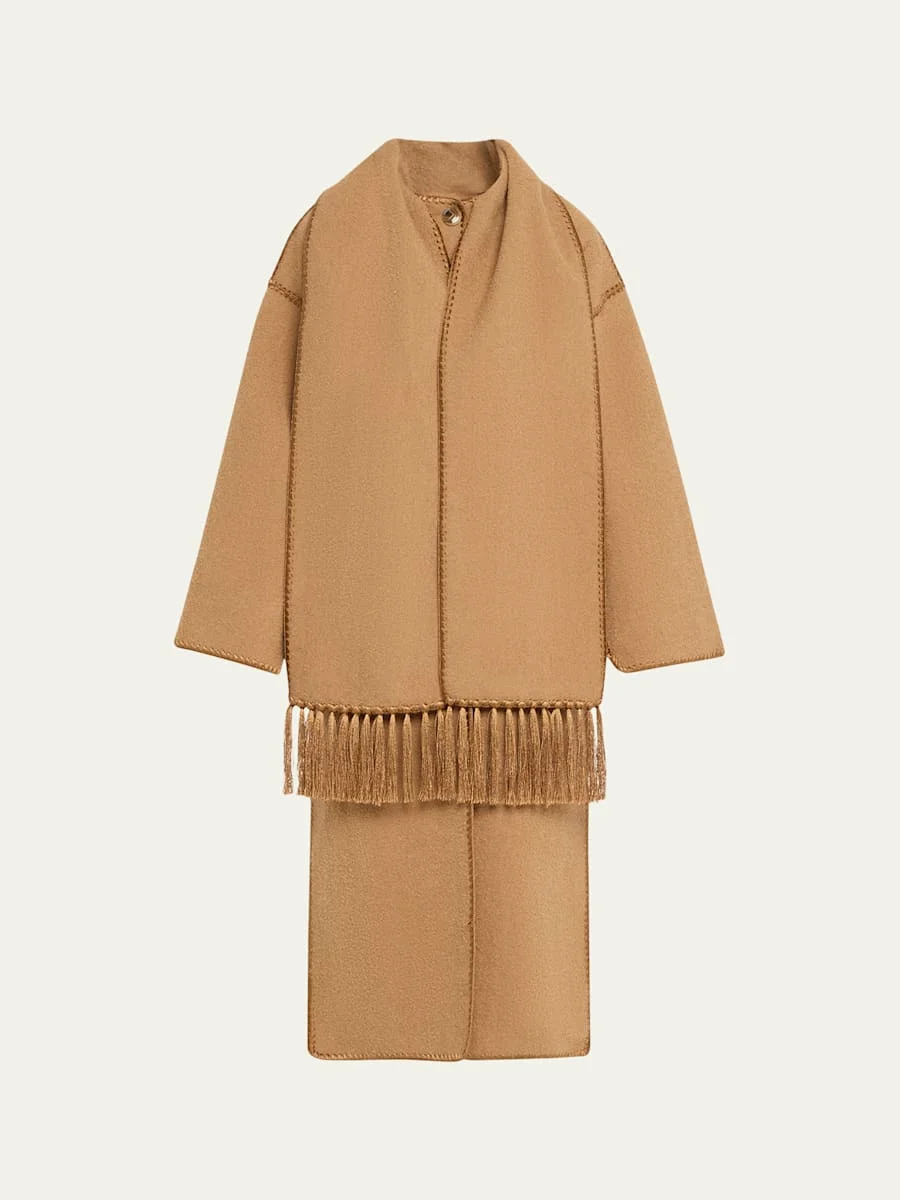 Toteme coat features an embroidered scarf with fringe trim High neckline; button front Long sleeves Straight fit Side slits Wool Imported Model is 5'10"/177cm. Online Inquiries: BGS21_B9KAX| Store Inquiries: #4890657