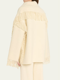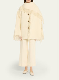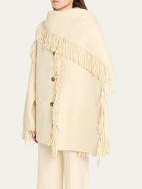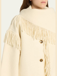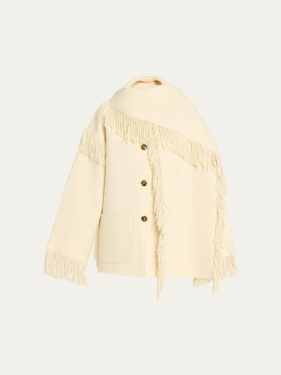 Made from woolblend boucle, this version of the signature scarf jacket by Toteme is complete with allaround fringe for added texture Attached scarf collar Long sleeves Front patch pockets Oversized, boxy silhouette Midlength Button front closure Wool/polyester Imported