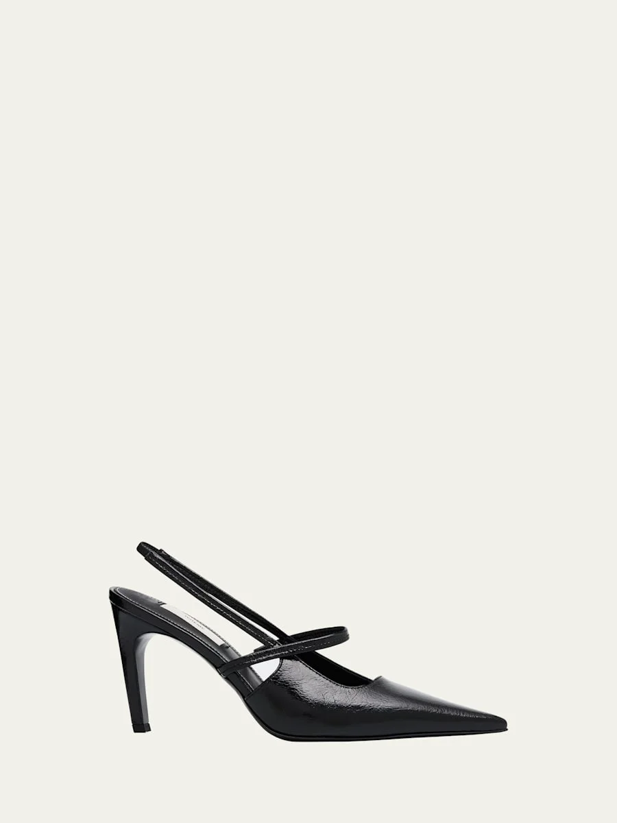 Toteme shiny crinkled leather slingback pumps reworked with a sculpted heel as an elevated take on stilettos 2.50 in / 65 mm stiletto heel Pointed toe Stretch Mary Jane strap and stretch slingback strap Slip-on style Leather outsole Lining: Leather Made in Italy Online Inquiries: BGS21_X6WDH| Store Inquiries: #5021050