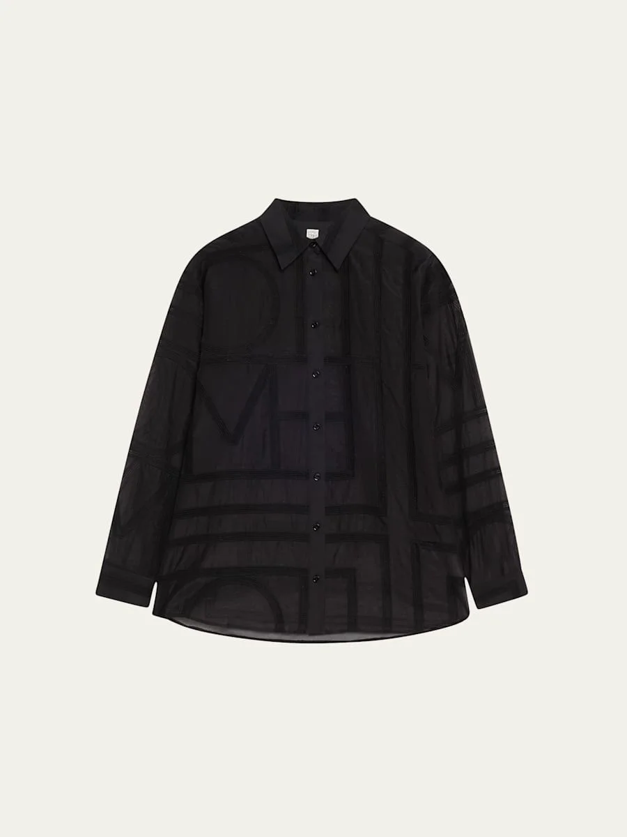 Toteme classic coton voile shirt animated with a crochet-inspired embroidery of the toteme monogram Point collar; button front Long sleeves; button cuffs Drop shoulders Yoked back; box pleat Oversized fit Organic cotton/silk Dry clean Imported Online Inquiries: BGS21_BA3F7| Store Inquiries: #5024747