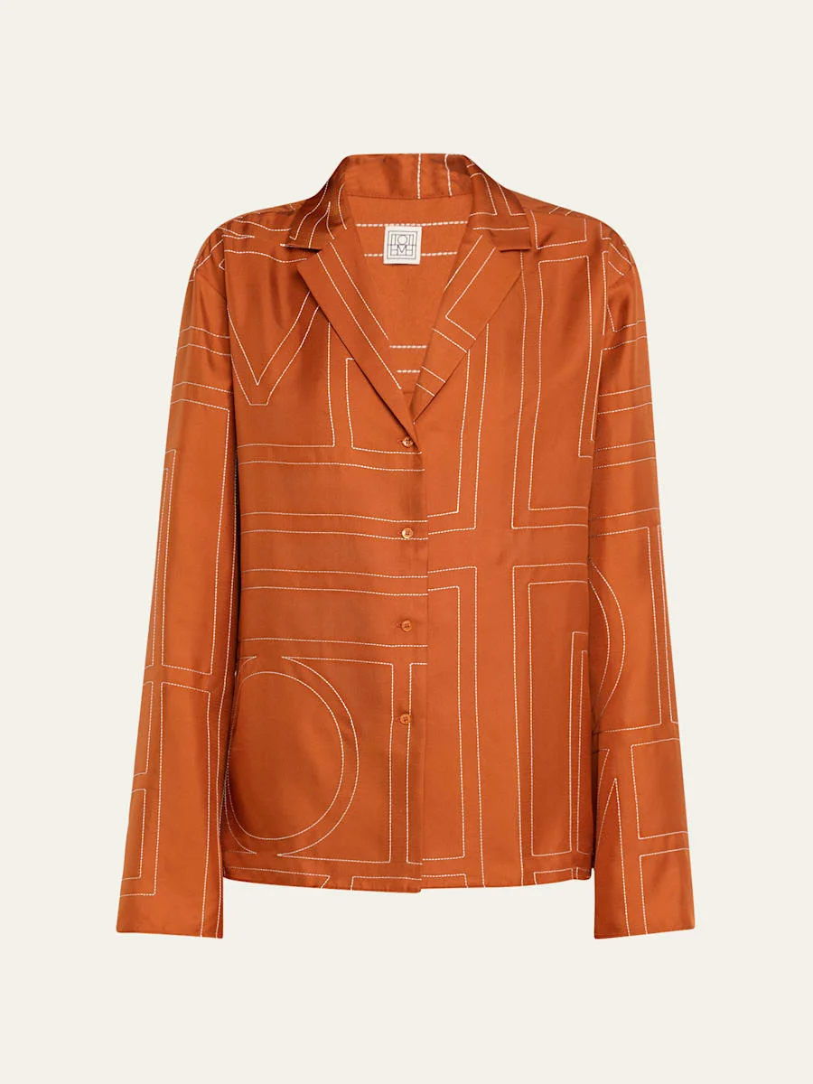 Toteme silk pajama top in an allover monogram print Notched collar Button closure Long sleeves Back yoke; pleated Mid-length Relaxed fit Silk Imported Model is 5'10"/177cm. Online Inquiries: BGS21_B9CJ6| Store Inquiries: #4836480