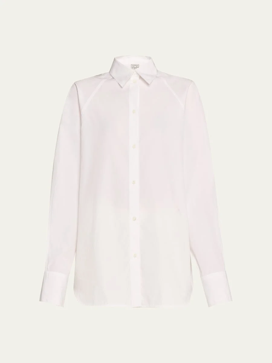 Toteme shirt crafted from classic organic-cotton poplin with a raw-edged collar and cuffs Point collar; button front Long raglan sleeves; button cuffs Boxy, oversized fit Shirttail hem Organic cotton Imported Online Inquiries: BGS21_BA3FH| Store Inquiries: #5024757