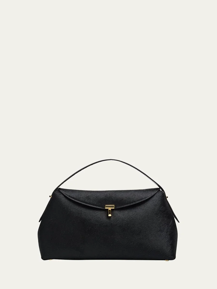 Toteme "T Lock" top handle bag in leather and natural/dyed horsehair (Italy) Top handle Detachable, adjustable shoulder strap Can be worn as a top handle or shoulder bag Flap top with T lock clasp closure Interior, one slip pocket Lining: Polyurethane Golden hardware Feet protect bottom of bag Approx. 6.7"H x 13.7"W x 4.5"D Made in Italy Online Inquiries: BGS21_V6ELZ| Store Inquiries: #4946715
