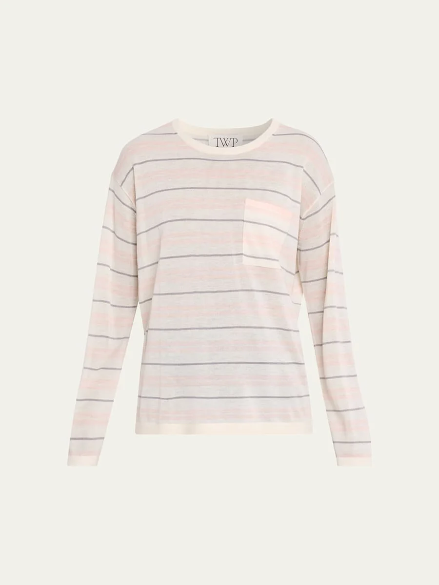 TWP's "4th St" top is knit from luxurious cashmere in a horizontal multistriped pattern Approx. 25.5"L from shoulder to hem Crew neckline Dropped shoulders Long sleeves Single chest patch pocket Relaxed fit Hip length Pullover style Cashmere Dry clean Imported
