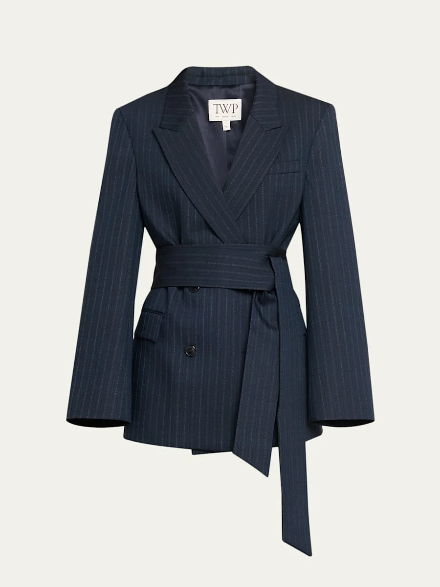 Made from striped wool suiting with a touch of stretch, the "Delancey" blazer by TWP is finished with a waist-defining self-tie belt Peak lapels; double-breasted front Strong shoulders Long sleeves Chest welt pocket Hip flap pockets Relaxed, boxy silhouette Mid-length Wool/elastane Made in USA from imported materials Online Inquiries: BGS21_T8S72| Store Inquiries: #5387526