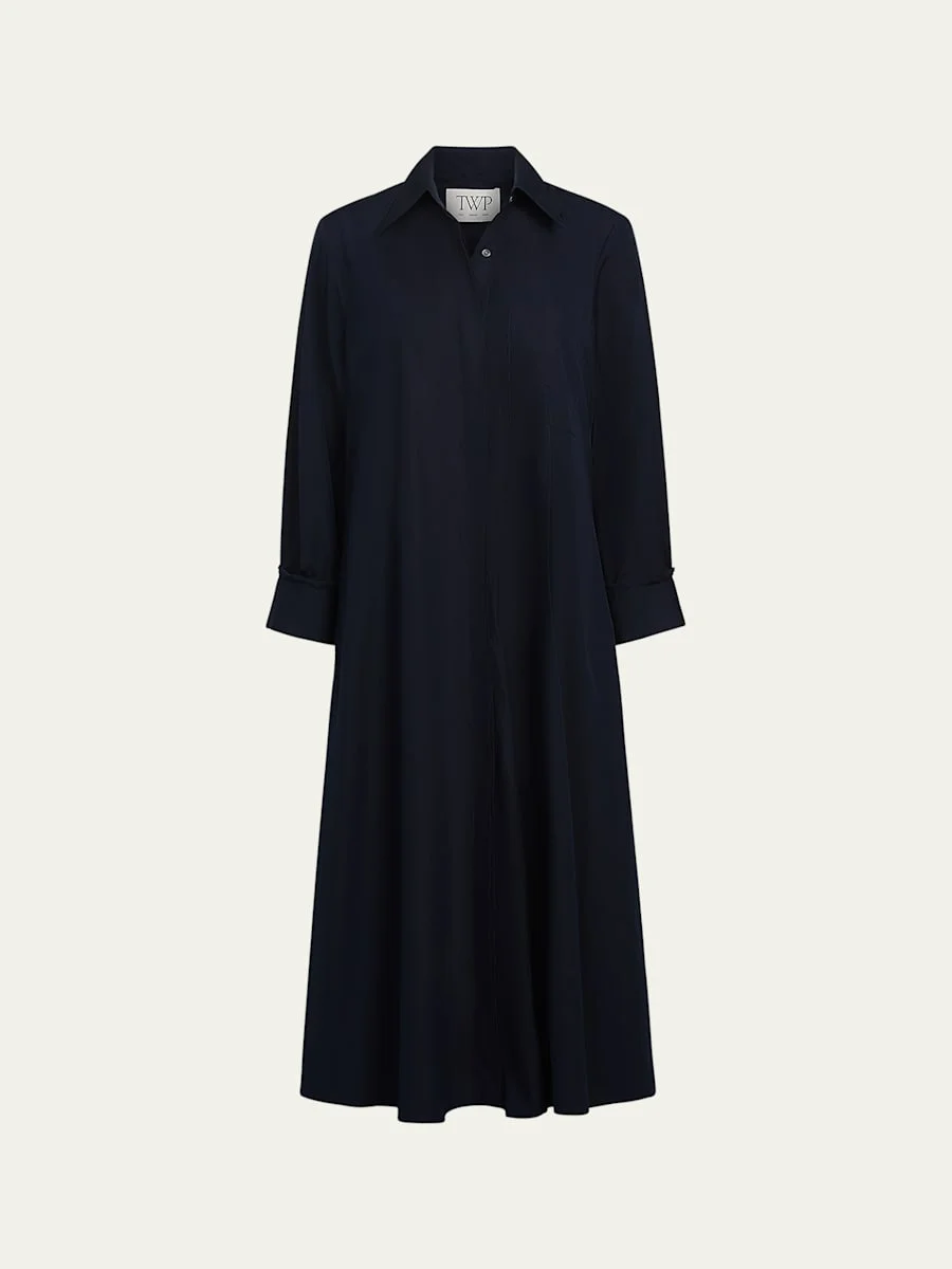 TWP "Jennys Gown" poplin shirtdress Spread collar; concealed button front Long sleeves; single-roll button cuffs Single chest patch pocket Side seam pockets Box-pleated back yoke Full length A-line silhouette Cotton Dry clean Made in USA from imported materials Online Inquiries: BGS21_T6T1B| Store Inquiries: #5031056