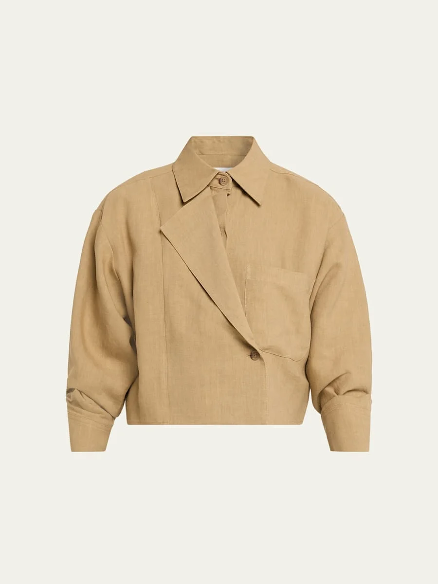Made of flax linen with a washed finish and soft touch, TWP's "Next Chapter" top features an asymmetrical front placket Point collar Long sleeves; signature doubleroll button cuffs Chest patch pocket Relaxed, boxy silhouette Cropped hem Button front closure Linen Dry clean Made in USA SIZE amp; FITModel measurements: 5'10" tall Model is wearing a US size 4/Small