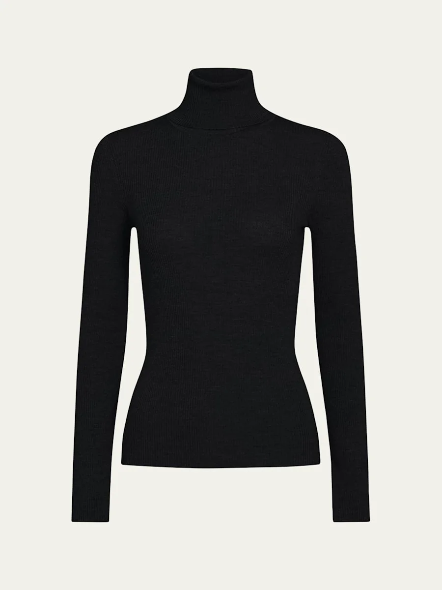TWP lightweight ribknit sweater Turtleneck Long sleeves Slim fit Hip length Pullover style Wool Dry clean Imported