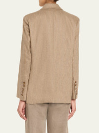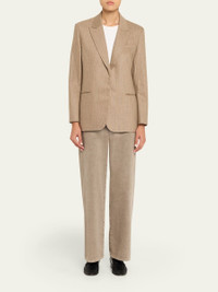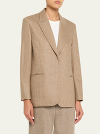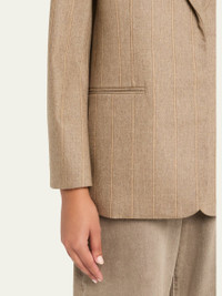 Expertly tailored from a stretch wool-blend suiting, the "Sweet Pea" blazer by TWP features a subtle pinstripe pattern and precise darting Approx. 29"L from shoulder to hem Peak lapels; single-breasted front Padded shoulders Long sleeves; button cuffs Chest welt pocket Hip besom pockets Oversized fit Mid-length Wool/cashmere/elastane Made in USA from imported materials Online Inquiries: BGS21_T8S6U| Store Inquiries: #5387508