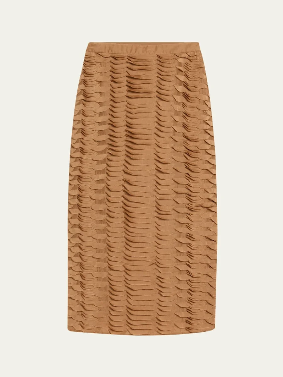 Crafted from a highquality blend of cotton and silk, the "Sylkie" skirt by TWP features a unique, layered design for a textured fishscale effect Midrise waistband Centercut back vent Hem falls below the knee Aline silhouette Cotton/silk Dry clean Imported